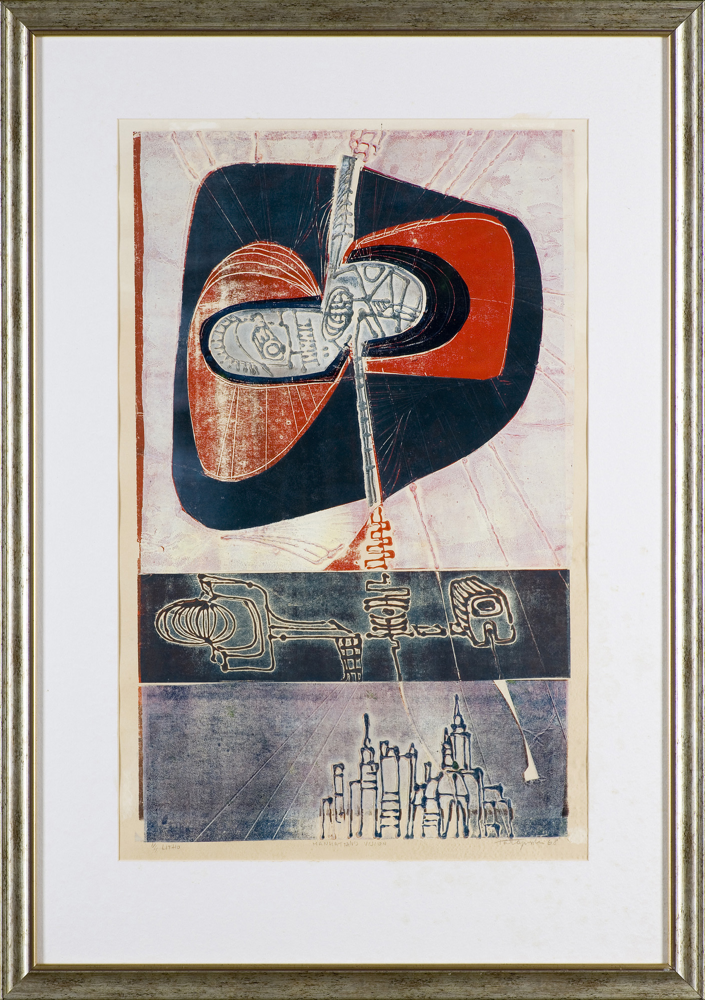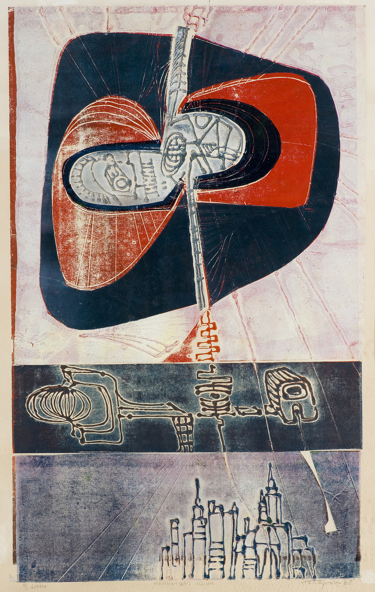 signed in lead under the engraving left: 1/4 LITHO, middle: MANHATTAN'S VISION, bottom: TaŁapiński 68