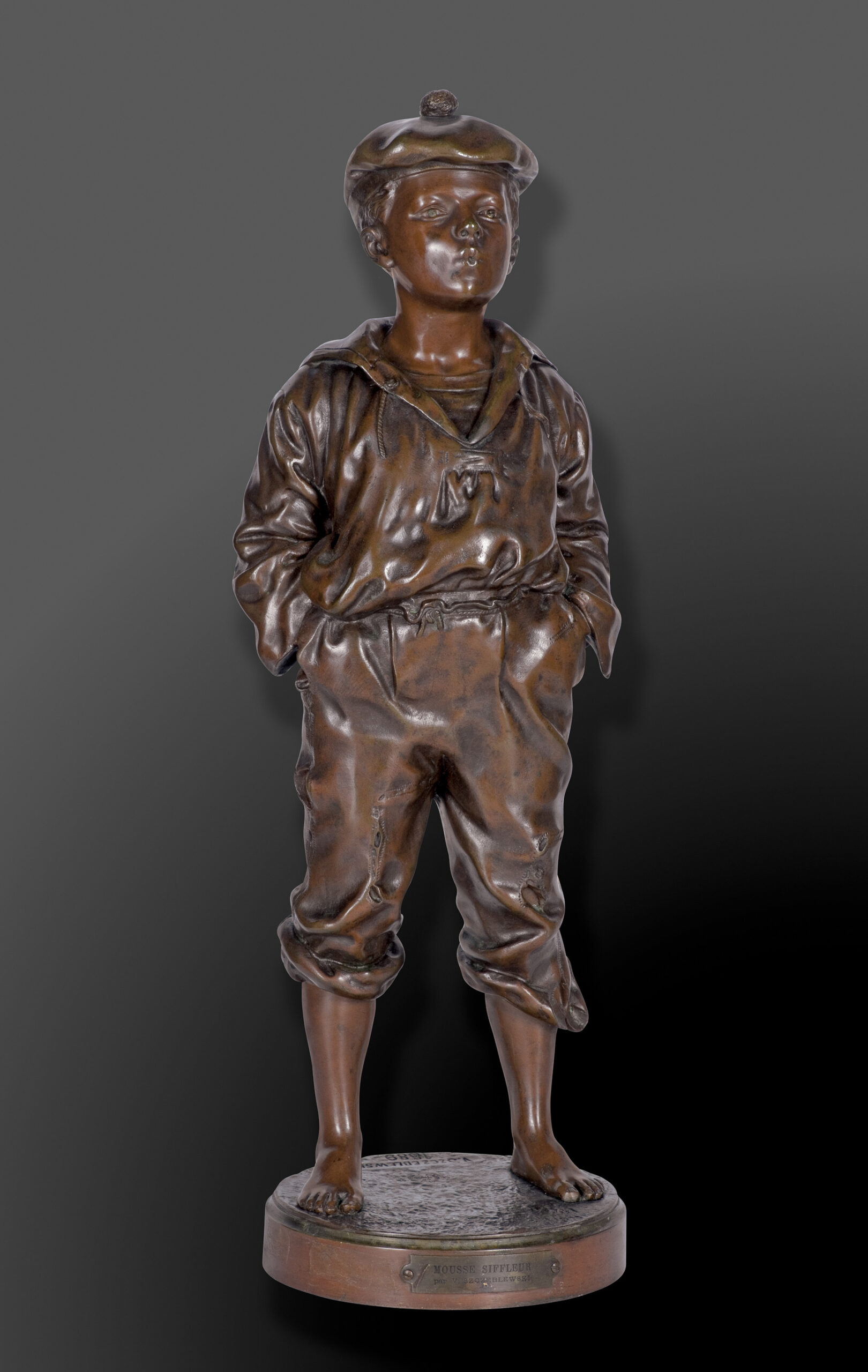 on the bottom, the number is stamped: 3784; on the base, a plate with the title of the figure and the name of the artist: MOUSSE SIFFLEUR | par V. SZCZEBLEWSKI