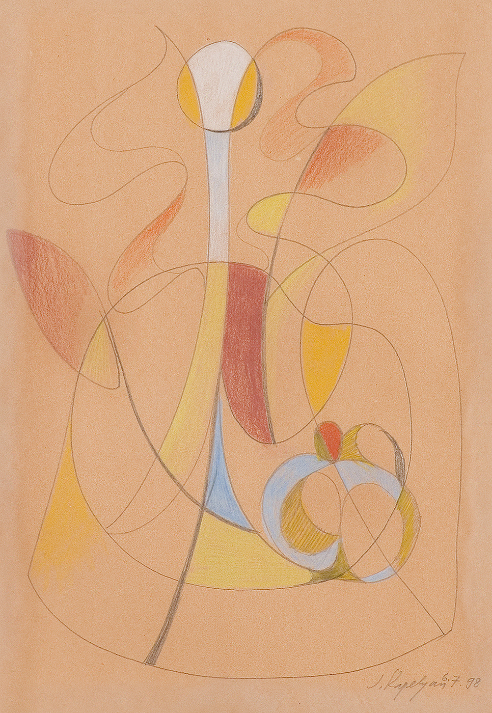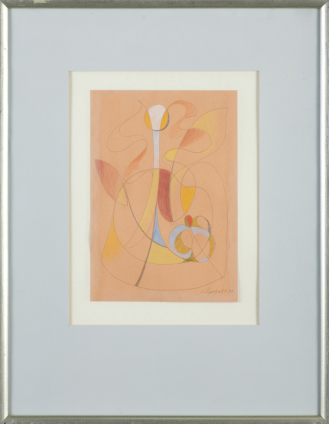 na odwr. oprawy napis flamastrem: 28 [w ramce] PR 1004 | 28 Joseph Kapelyan | „Abstract composition, II”, 1998 | paper, colour pencil, | 33 x 22,5 cm, poniżej nalepka drukowana z danymi obrazu